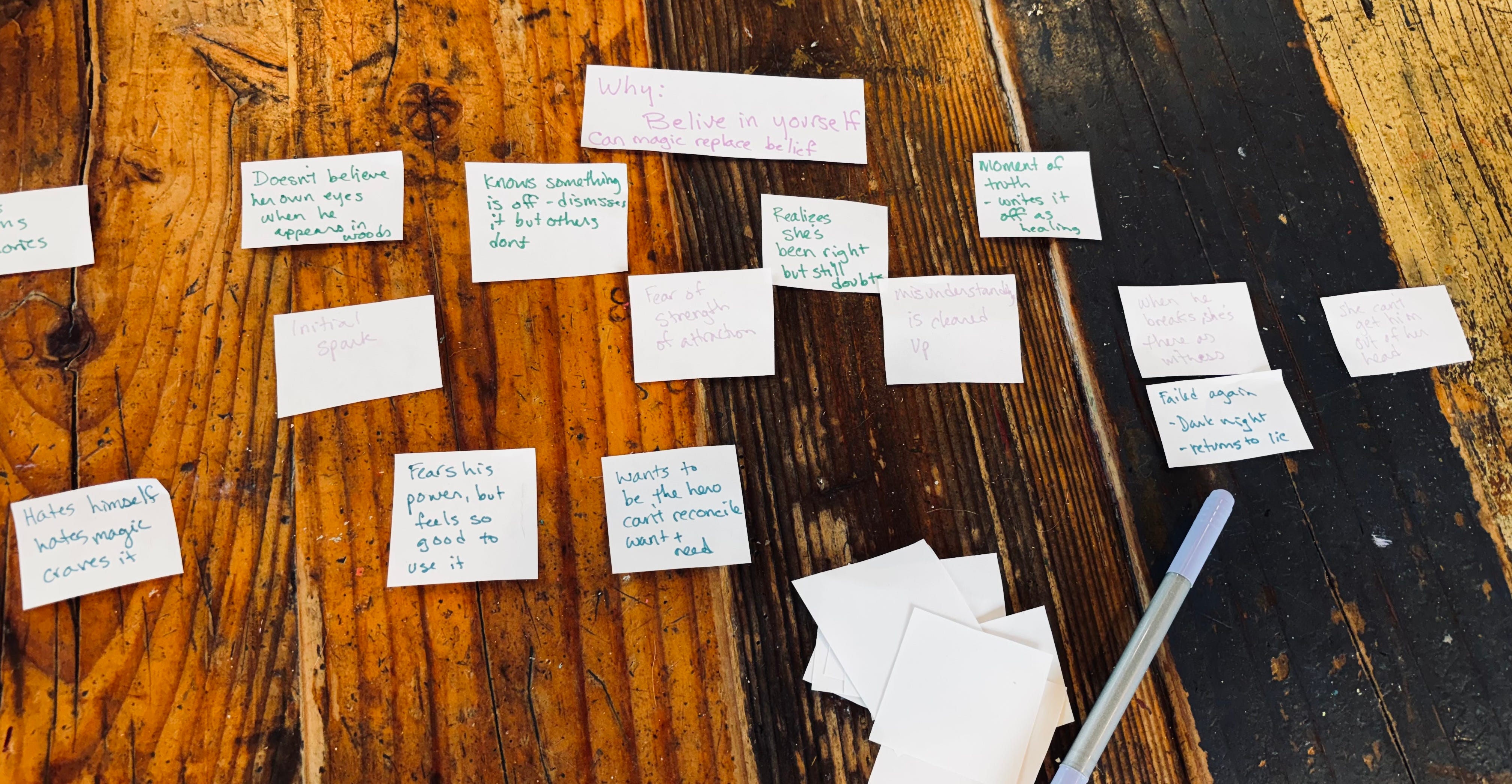 I also like to read author pep talks or give myself one of my own. Regardless, once I’m in a mindset to do the work, I sit down with a handful of post-its, or index cards, or even just blank paper and a pencil (though this is harder to make changes to).